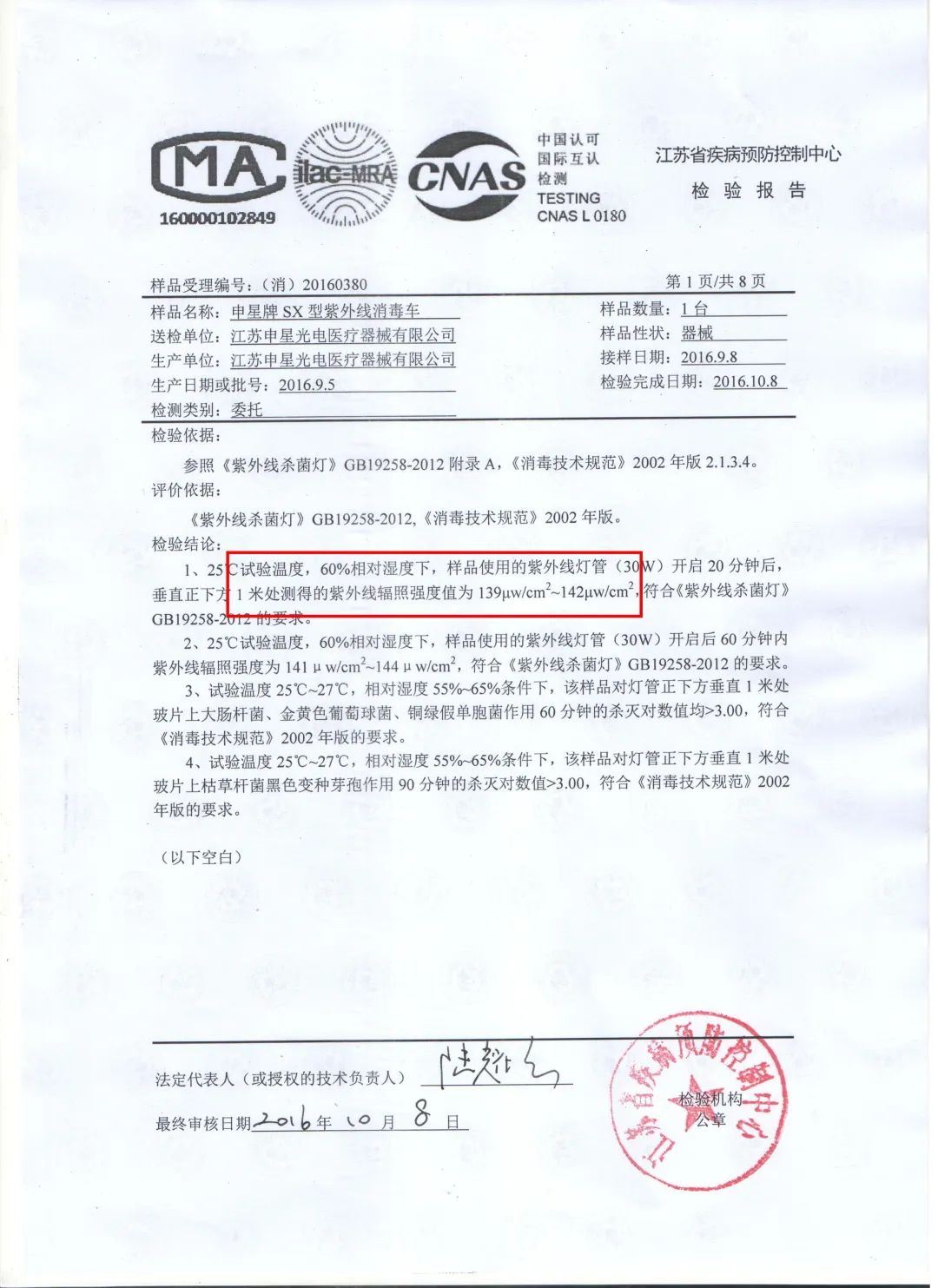 《紫外线杀菌灯》GB 19258-2012中要求,1米处紫外线强度必须达到一定的标准才能达到消毒效果。PA视讯光电紫外线消毒车垂直正下方1米处测得的紫外线辐照强度值为139uw/c㎡~142uw/c㎡。